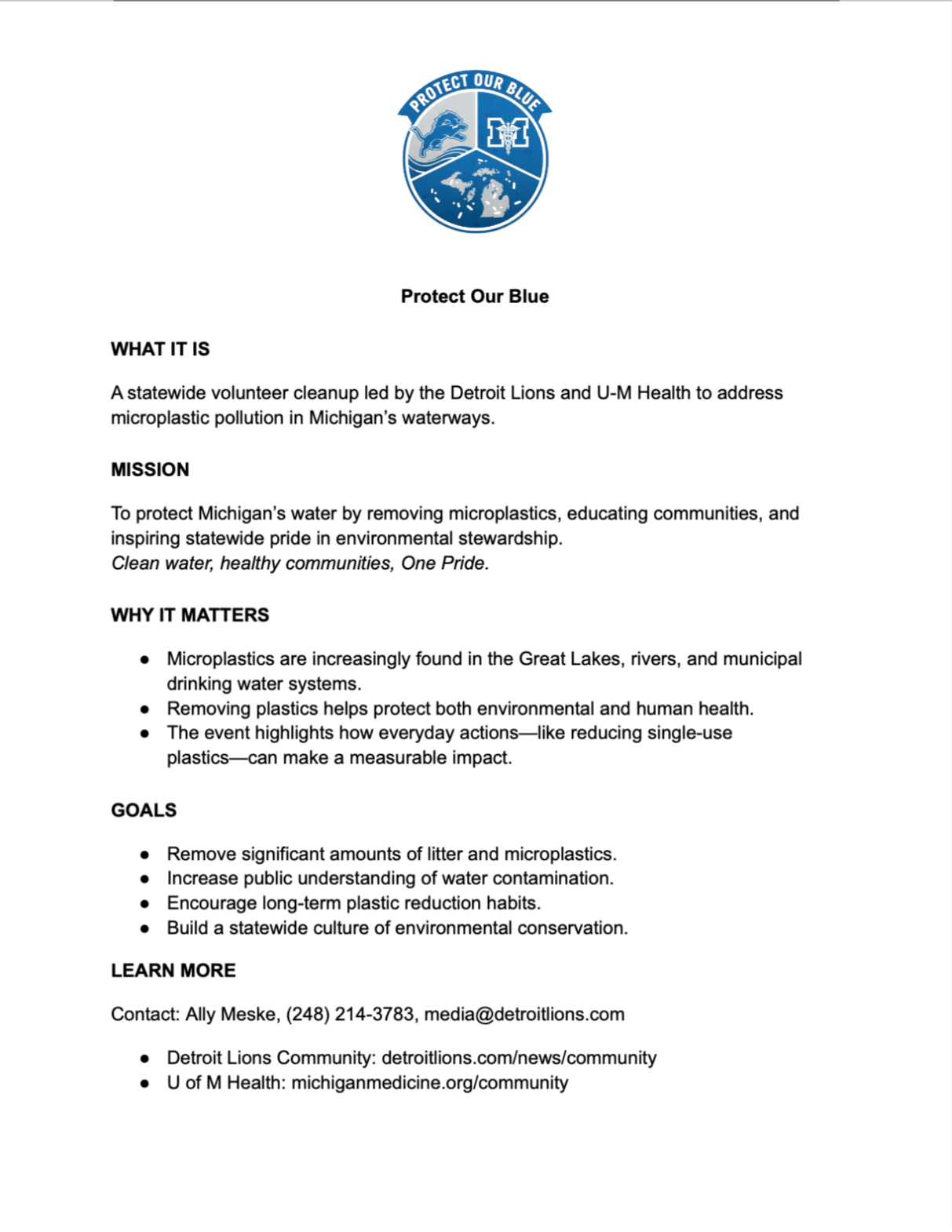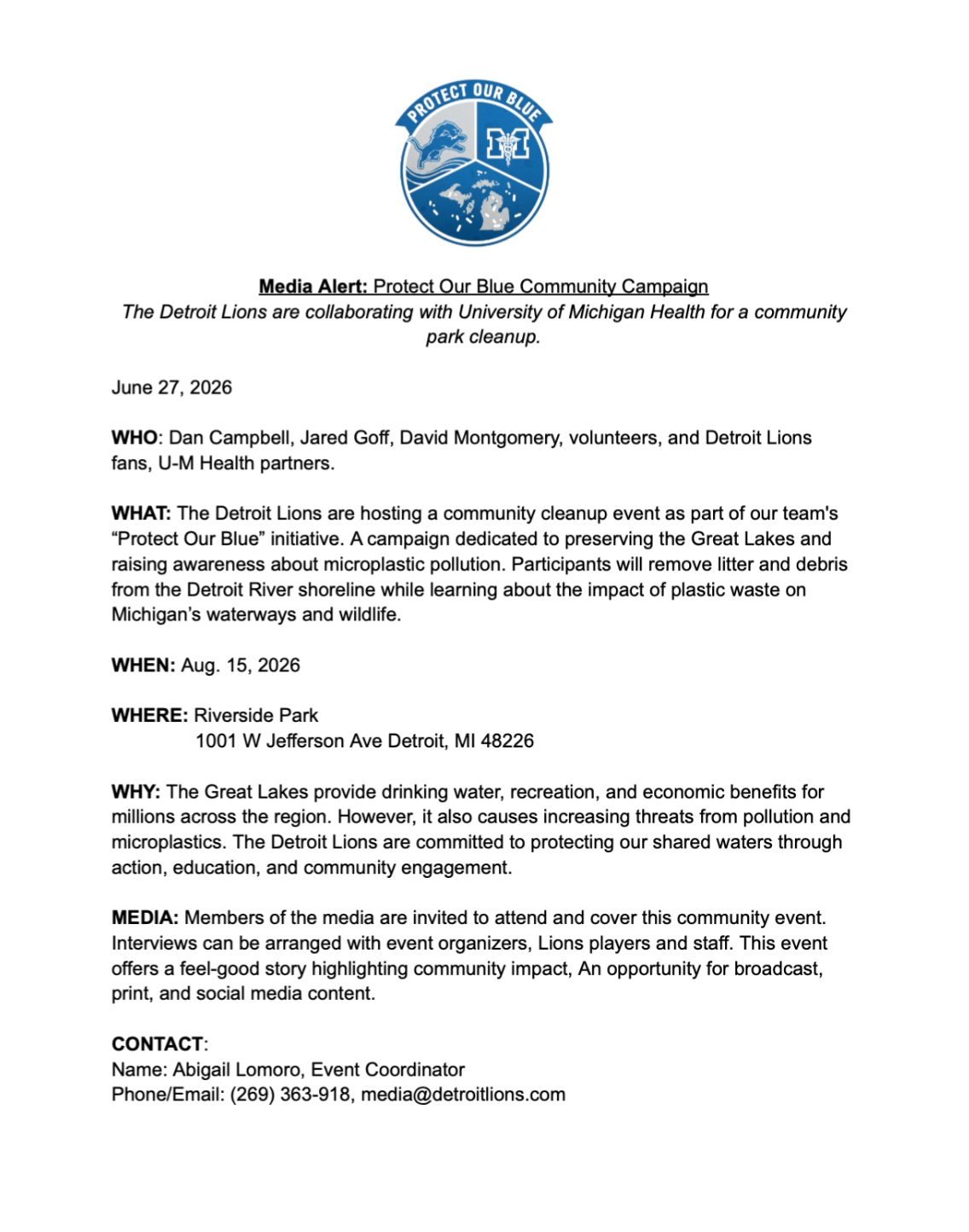 8th January 2026 MOCK PRESS RELEASE: Detroit Lions and University of Michigan Health to Partner for “Protect Our Blue” Campaign